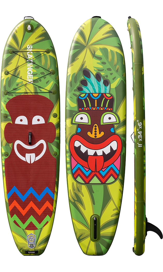 La tabla SUP inflable Crazy Tribe de Skatinger aporta un diseño atrevido y una energía lúdica a cada experiencia sobre el agua, perfecta para remo recreativo, touring ligero o diversión en familia. Con una longitud de 335 cm, un ancho de 86,4 cm y un grosor de 15,2 cm, ofrece una estabilidad fiable y una excelente flotabilidad para una amplia variedad de usuarios.