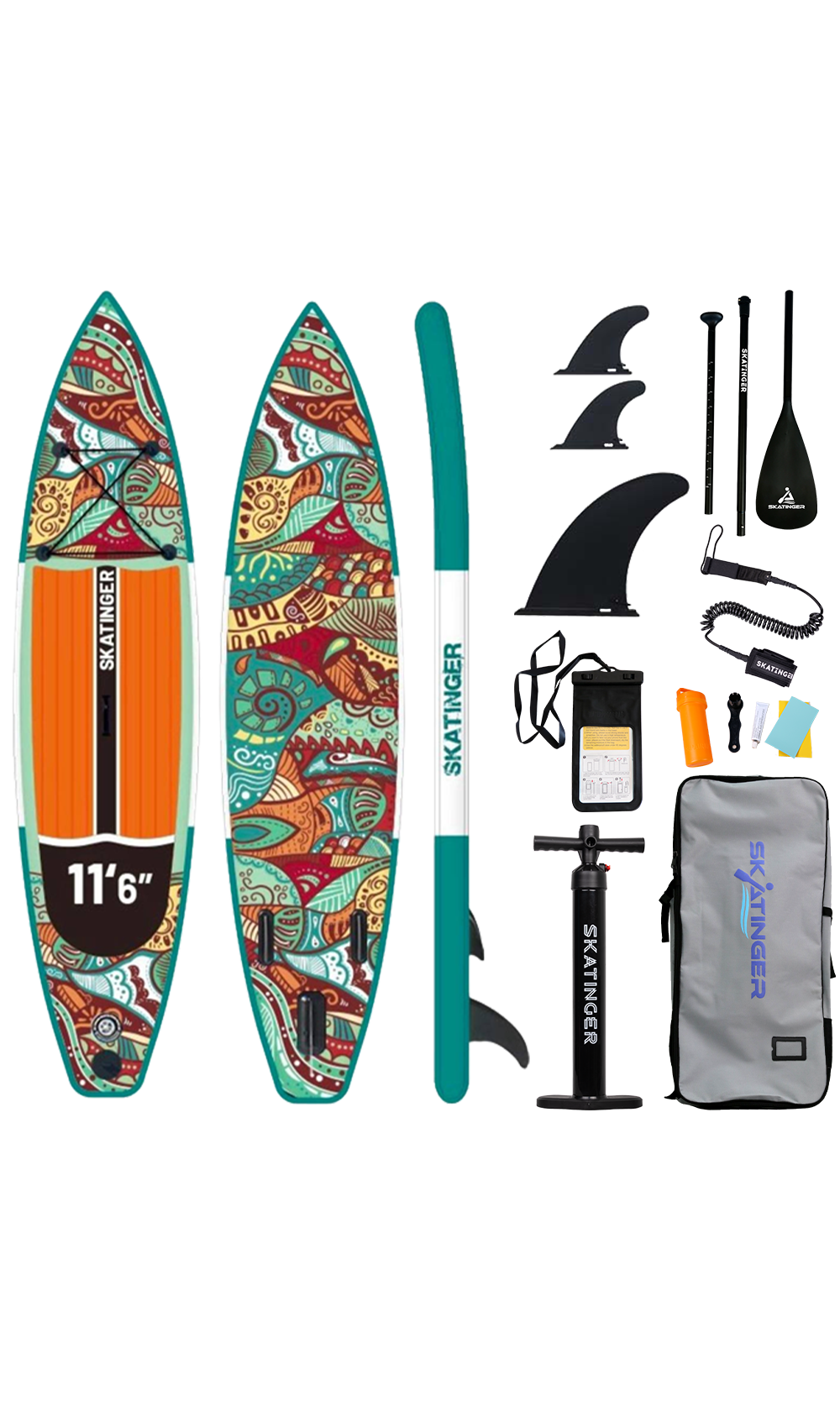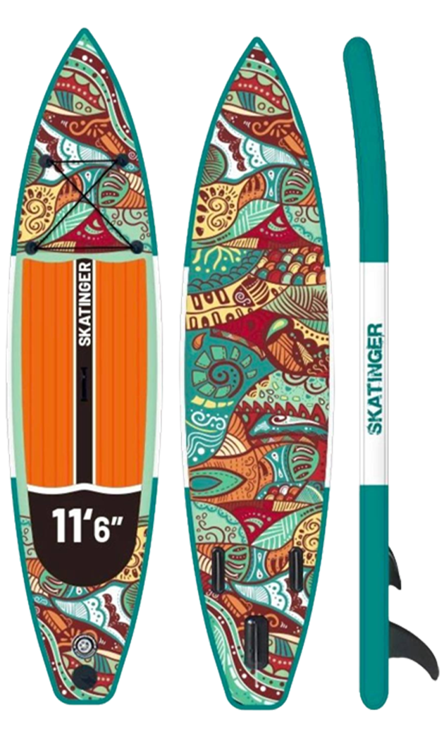 Con 350,5 cm de longitud y 81,3 cm de anchura, Norm ofrece un seguimiento estable y un equilibrio cómodo, ideal para touring ligero, remo recreativo o largas jornadas sobre el agua. La cálida superficie EVA de color naranja contrasta con los patrones dinámicos inferiores, mientras que su construcción drop stitch de una sola capa garantiza agilidad sin perder solidez.