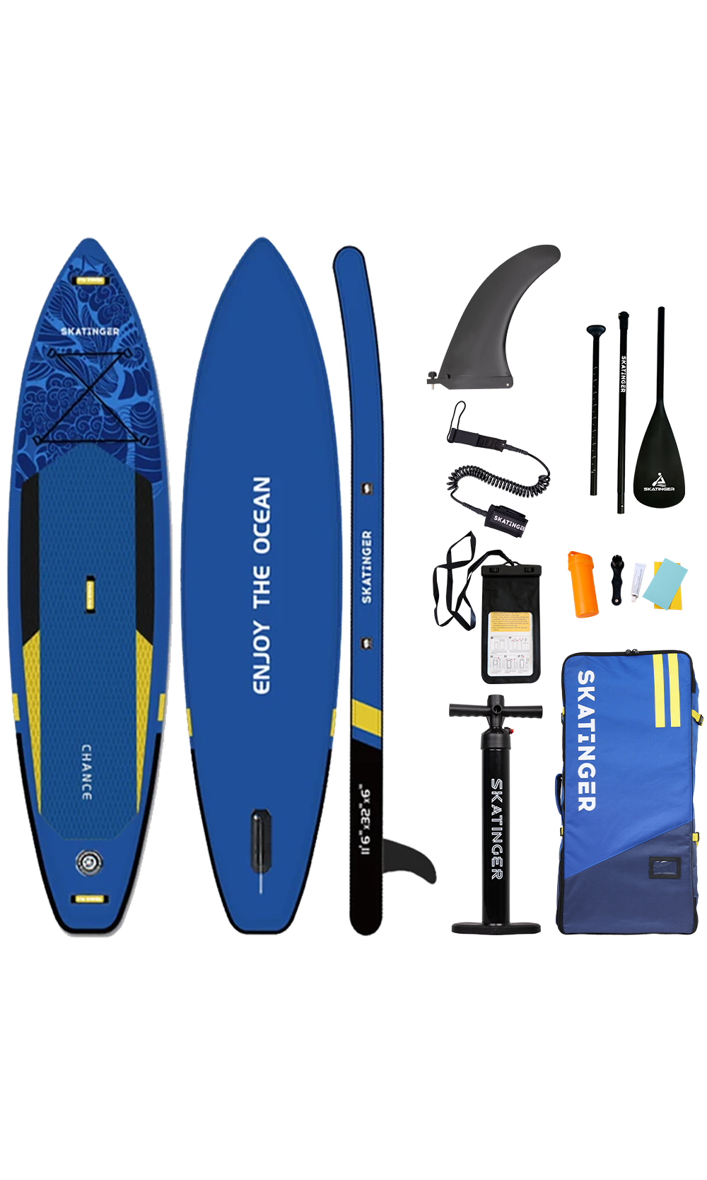 La tabla SUP touring Chance Blue está diseñada para palistas que valoran la resistencia, la fluidez y un diseño limpio. Sus tonos azul océano profundo, los detalles geométricos y su silueta potente transmiten control, comodidad y confianza en recorridos largos y aguas abiertas.