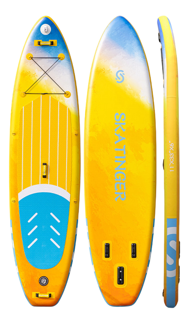 Sus tonos amarillos bañados por el sol se funden con suaves matices azules, evocando playas doradas y brisas tropicales. La construcción single-layer mantiene la tabla ligera, mientras que su volumen de 375 L y una capacidad de hasta 155 kg la hacen adecuada para una amplia variedad de riders.