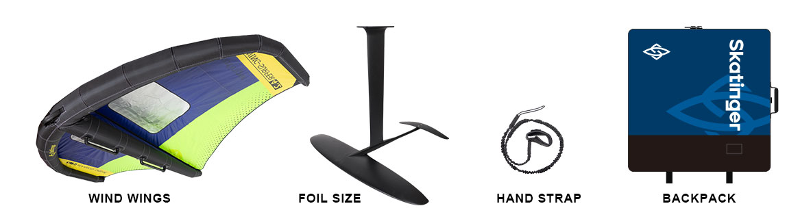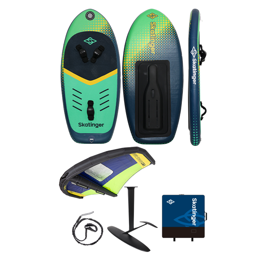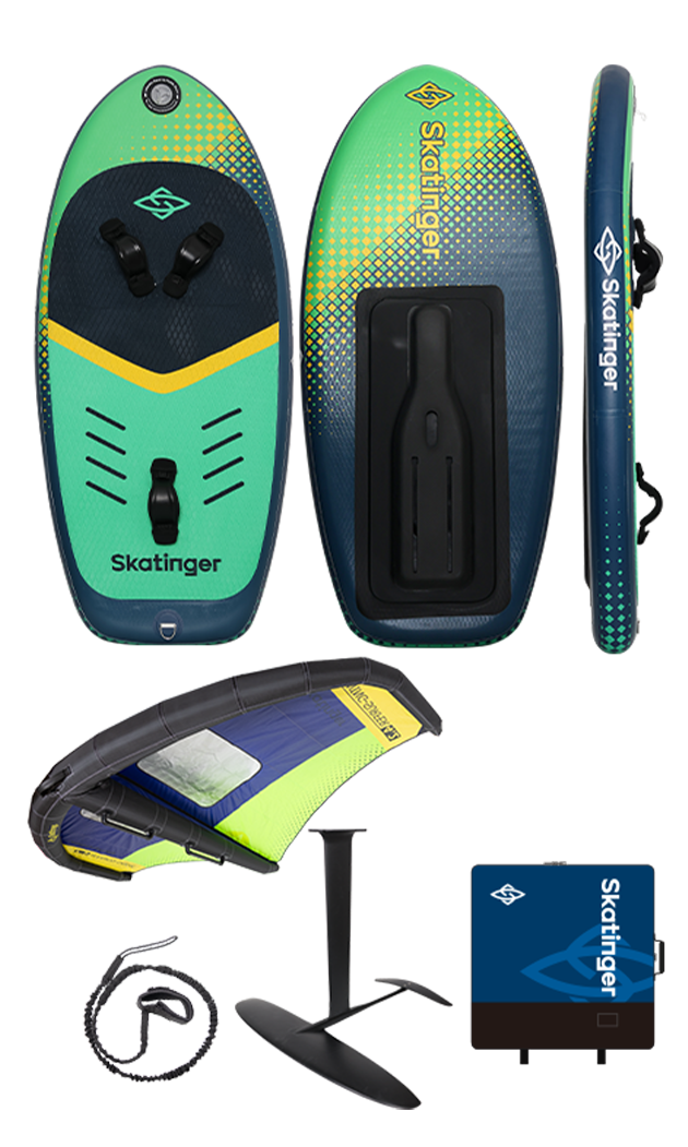 El Skatinger Inflatable Foil Set es una solución completa que incluye todo lo que necesitas para iniciarte en el wing foiling: una tabla foil inflable y estable, un potente wing (disponible en diferentes tamaños) y un sistema de hidrofoil de alto rendimiento.